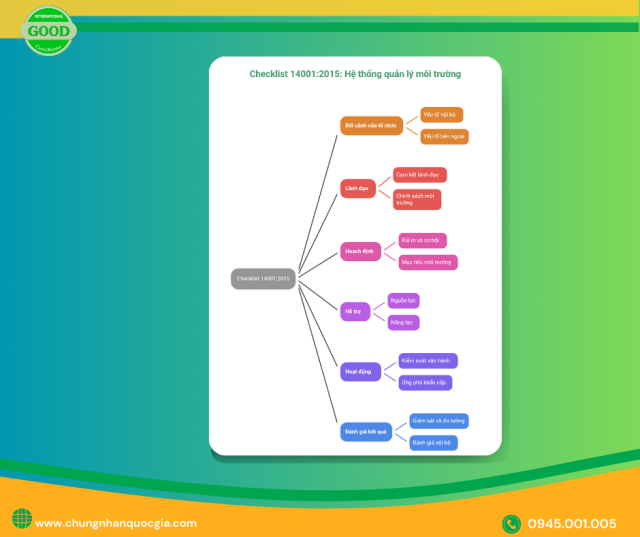 hecklist đóng vai trò như “bản đồ điều hướng” cho doanh nghiệp trong suốt quá trình triển khai ISO 14001:2015: từ giai đoạn xây dựng tài liệu, triển khai thực tế, đào tạo, giám sát, đến đánh giá nội bộ và xem xét của lãnh đạo. Việc sử dụng checklist còn giúp doanh nghiệp kiểm tra mức độ tuân thủ của từng phòng ban, từng quy trình, từng yêu cầu pháp lý môi trường, và các hoạt động kiểm soát khía cạnh môi trường như chất thải, khí thải, nước thải, hóa chất, năng lượng, tiếng ồn…
