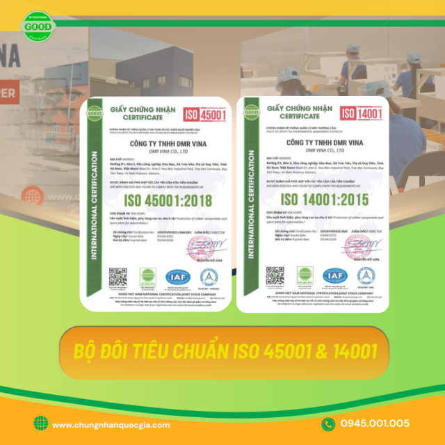Mới đây, Công ty TNHH DMR VINA – doanh nghiệp chuyên sản xuất linh kiện và phụ tùng ô tô – đã chính thức đạt chứng nhận ISO 14001:2015 và ISO 45001:2018, do GOOD Việt Nam đánh giá và cấp chứng nhận. Đây là dấu mốc quan trọng thể hiện cam kết của DMR VINA trong việc phát triển bền vững, an toàn và có trách nhiệm với môi trường.